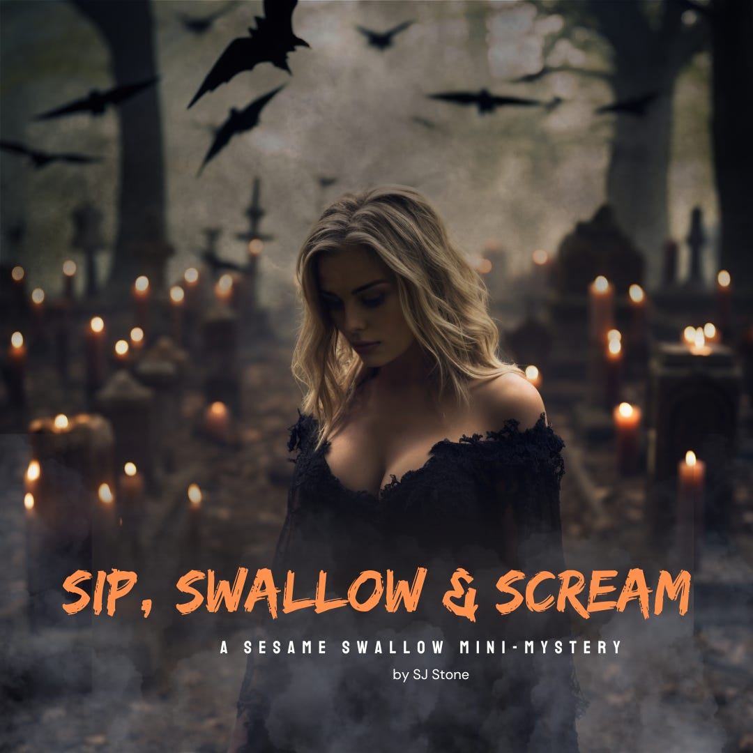 Sip, Swallow & Scream is a paranormal Poe-themed mini-mystery based in the fictional world of Baltimore’s sexiest sleuth, Sesame Swallow, whose novels are still being written, even as I write these fun, holiday-themed adventures.